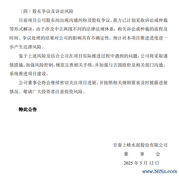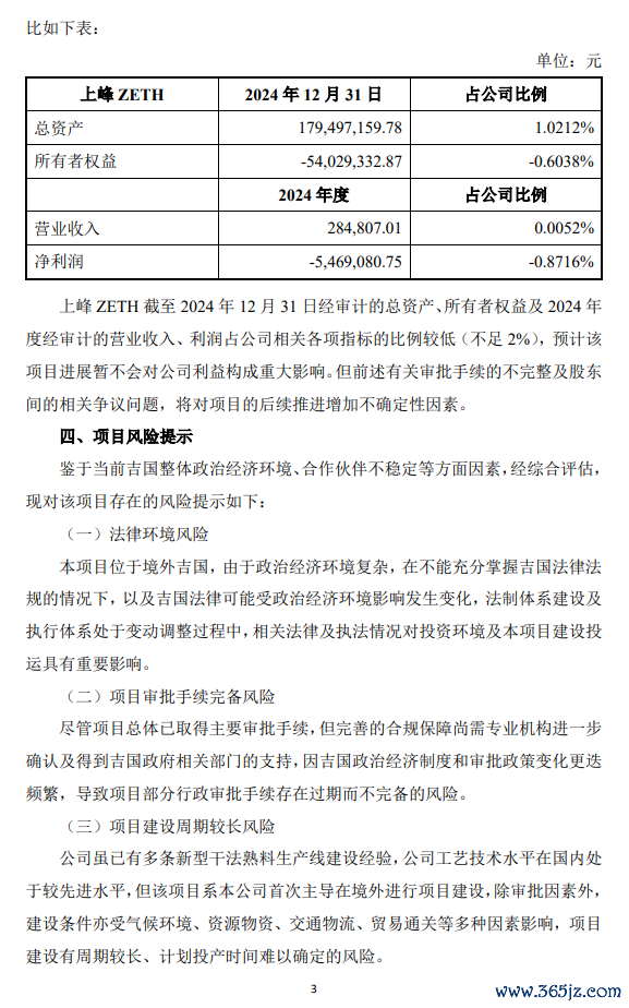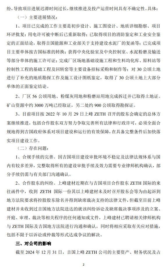 截至2024年12月31日,上峰ZETH的总资产为1.79亿元,归母净利润约亏损547万元,营业收入为28万元,均占公司相关指标的比例较低,预计对公司利益影响不大。然而,审批手续不完整及股东间的争议可能增加项目推进的不确定性。公司计划采取法律手段解决股东争议,并将继续加强风险控制与沟通,以推进项目建设。